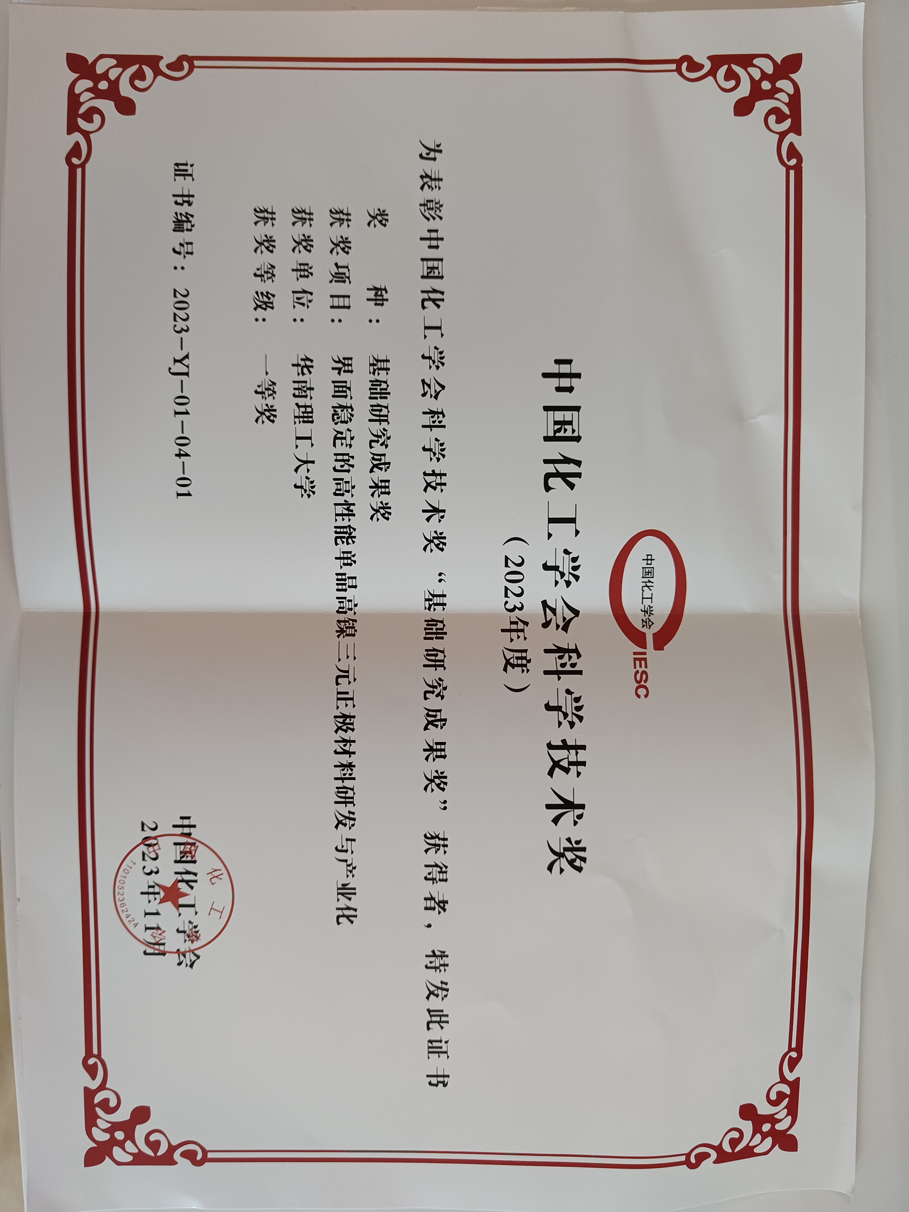 本实验室团队以“界面稳定的高性能单晶高镍三元正极材料研发与产业化”的项目荣获2023年度中国化工学会科学技术奖“基础研究成果奖”一等奖。
