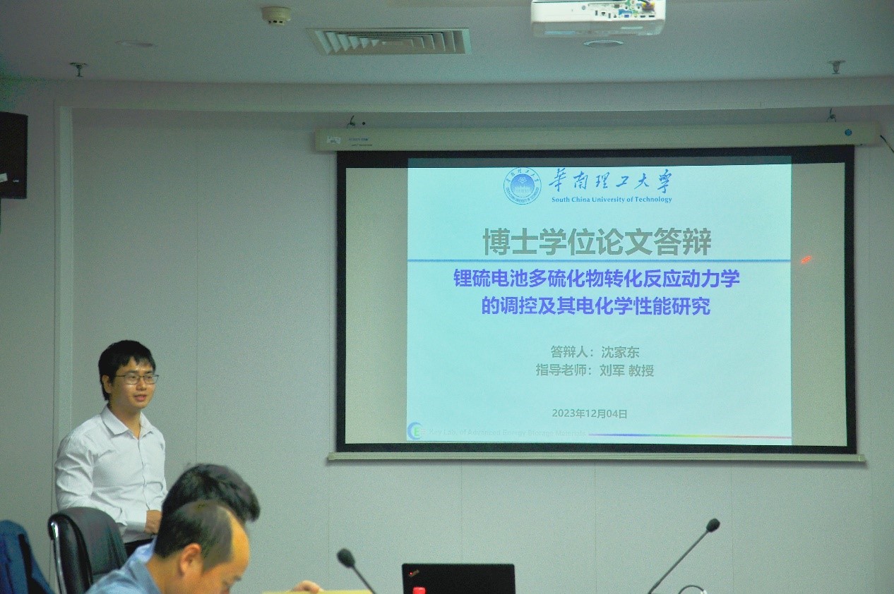 2023年12月4日, 在华南理工大学大学城校区一楼会议室,沈家东等四位博士研究生举行了其博士学位论文答辩。沈家东博士的论文题目为“锂硫电池多硫化物的转化反应动力学调控及其电化学性能研究”,指导老师为华南理工大学的刘军教授。华南师范大学的兰亚乾教授担任本次论文答辩委员会主席。委员会成员包括暨南大学的王小健研究员、中山大学的刘书乐副教授、华南理工大学的王辉教授、袁斌教授、杨黎春教授,以及刘军教授。华南理工大学的刘雨轩专职副研究员担任答辩秘书。沈家东博士围绕锂多硫化物(LPSs)的转化动力学及其在锂硫电池中的应用,用大约35分钟的时间对自己博士期间的工作内容进行了详细阐述。答辩委员会对其研究内容进行了深入的质询及讨论,并对沈家东博士在攻读博士学位期间的工作成果表示了肯定。在此次答辩中,沈家东博士不仅展示了他在学术上的卓越成就,还体现了他对于锂硫电池领域的深刻理解和创新贡献。经过约一小时的答辩,沈家东博士顺利通过了博士学位论文答辩。