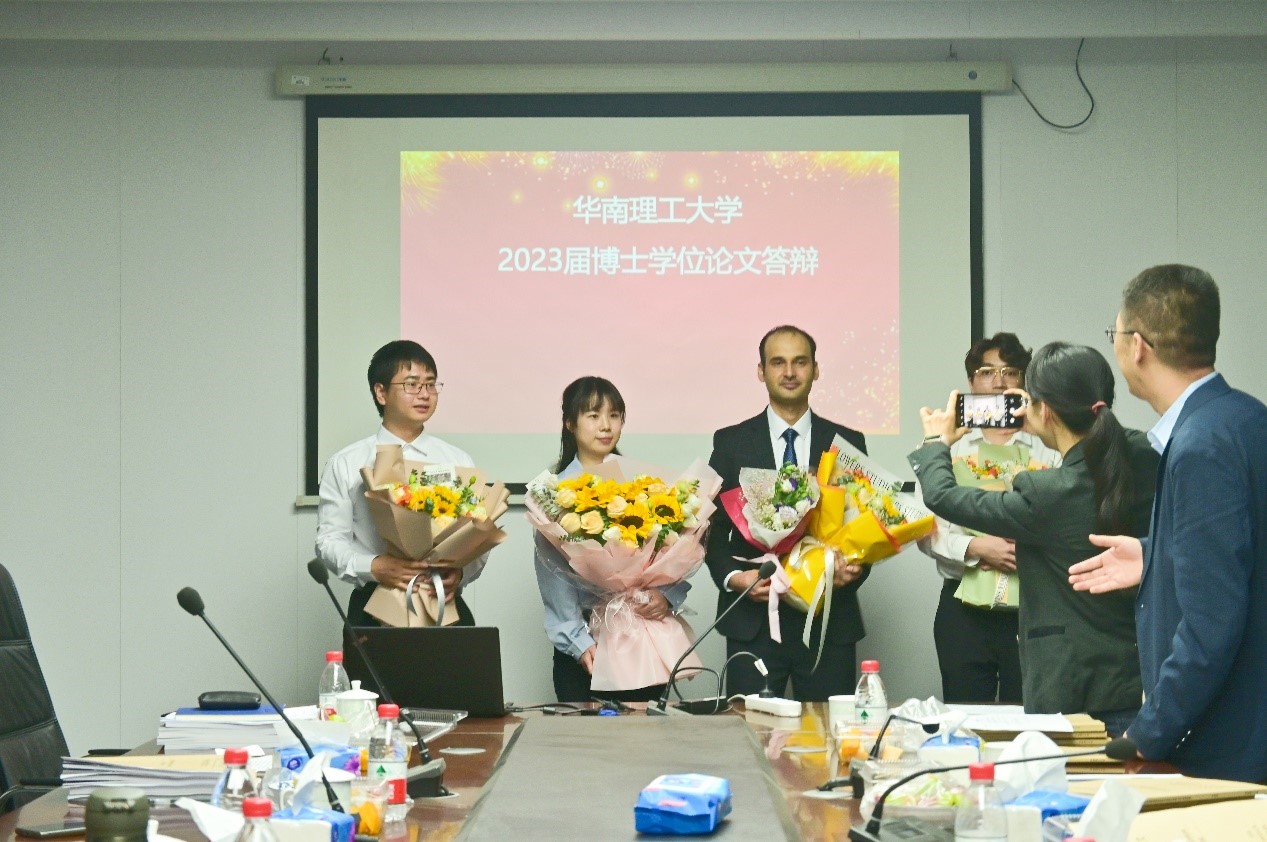 答辩委员会主席兰亚乾教授祝贺沈家东等五位博士研究生通过博士学位论文答辩