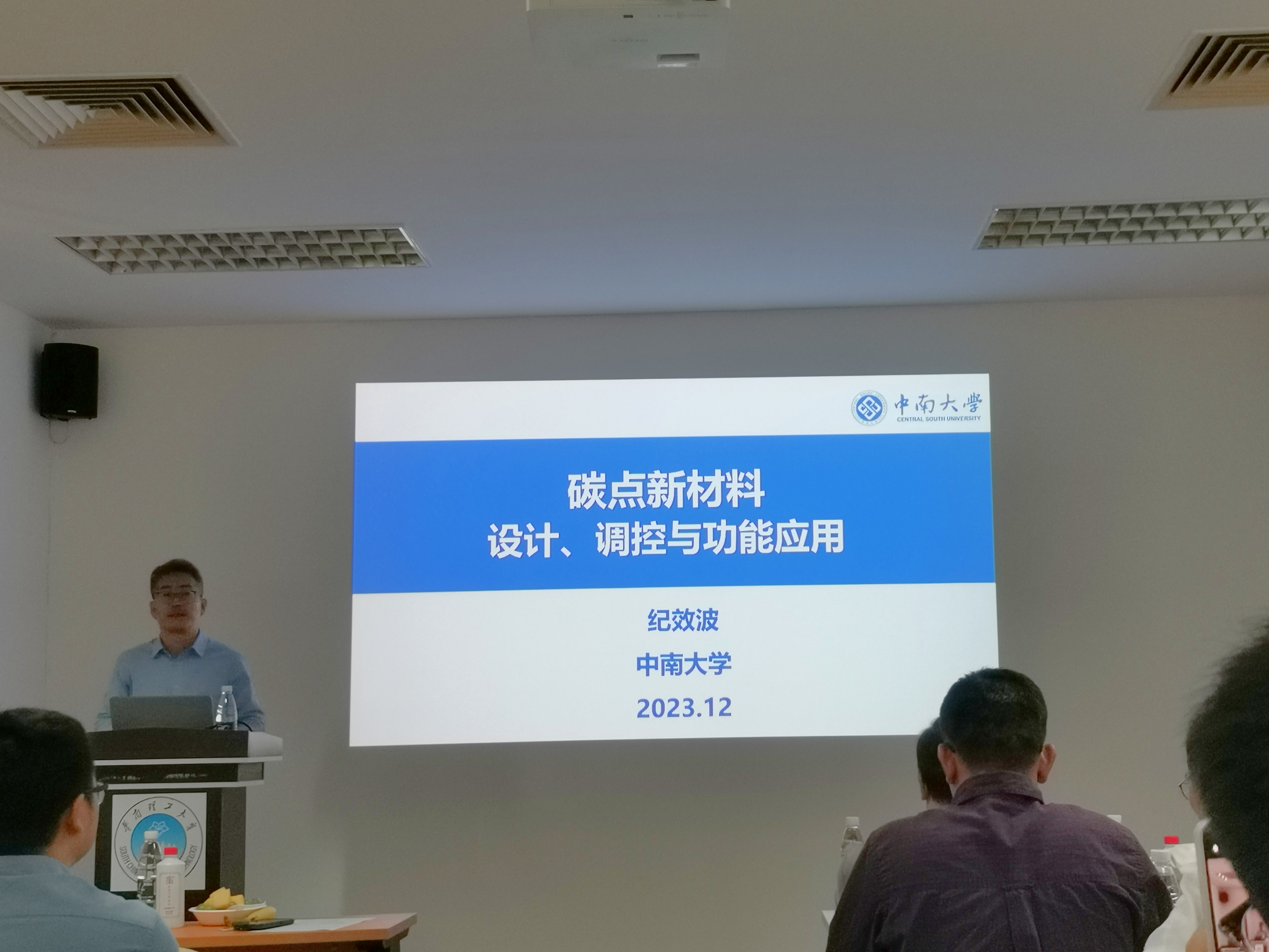 2023年12月15日下午3时许,中南大学纪效波教授到访本实验室进行学术交流,并在大学城B5副楼三楼会议室给实验室的师生分享了题目为“碳点新材料——设计、调控与功能应用”的学术报告。