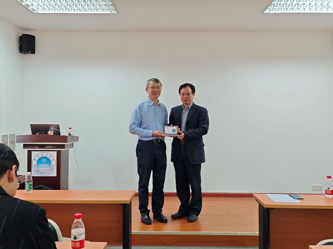欧阳柳章教授(右)向廖晓舟教授(左)赠送实验室纪念牌