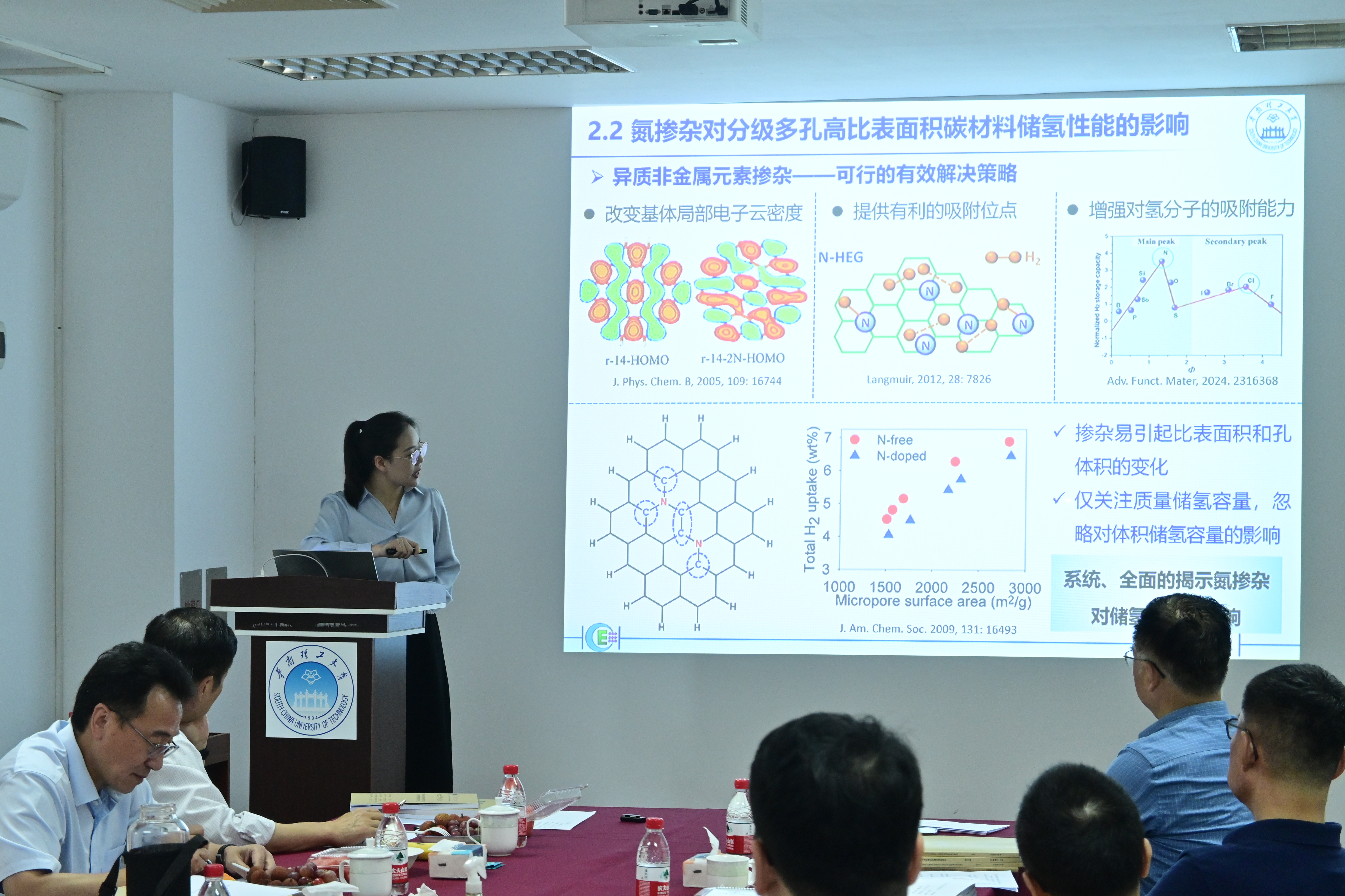 2024年6月4日,高雪等四位博士研究生在华南理工大学大学城校区B5-307会议室举行了博士学位论文答辩。高雪博士的答辩题目为“孔结构调控与元素掺杂对高比表面积多孔碳材料储氢性能的影响”,指导老师为朱敏教授。中南大学的杜勇教授担任本次论文答辩委员会主席,委员会委员有厦门大学的彭栋梁教授,中山大学的杨国伟教授和王成新教授,华南理工大学的朱敏教授、欧阳柳章教授和刘军教授。华南理工大学的教授马龙涛担任答辩秘书。高雪博士围绕微孔率对高比表面积活性炭材料储氢性能的影响、氮掺杂对分级多孔高比表面积碳材料储氢性能的影响、及过渡金属单原子掺杂对高比表面积多孔碳材料储氢性能的改性,用约35分钟的时间对自己博士期间的工作内容进行了阐述。随后,答辩委员会对其博士期间的研究内容进行了交流及讨论,各位成员肯定了高雪博士在攻读博士学位期间的工作成果,并围绕其博士学位论文提出了意见与建议,经过约一个小时的答辩,高雪博士顺利通过博士学位论文答辩。