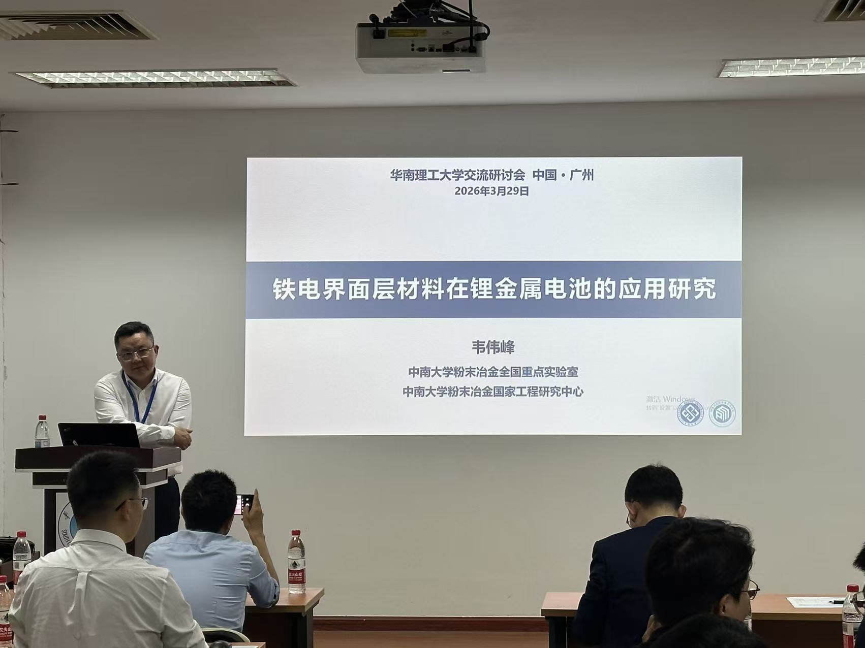 2026年3月29日下午3:30,中南大学韦伟峰教授到访本实验室进行学术交流,并在华南理工大学大学城校区B5栋副楼三楼会议室给实验室的师生分享了题目为“铁电界面层材料在锂金属电池的应用研究”的学术报告。