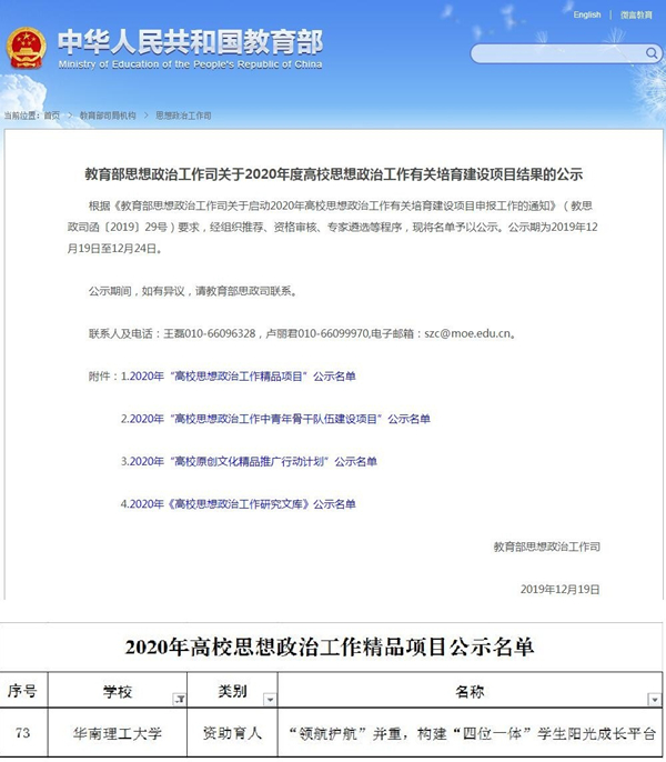 12月19日,教育部思想政治工作司公示2020年度高校思想政治工作有关培育建设项目结果,华南理工大学申报的资助育人项目——“‘领航护航’并重,构建‘四位一体’学生阳光成长平台”成功入选精品项目。