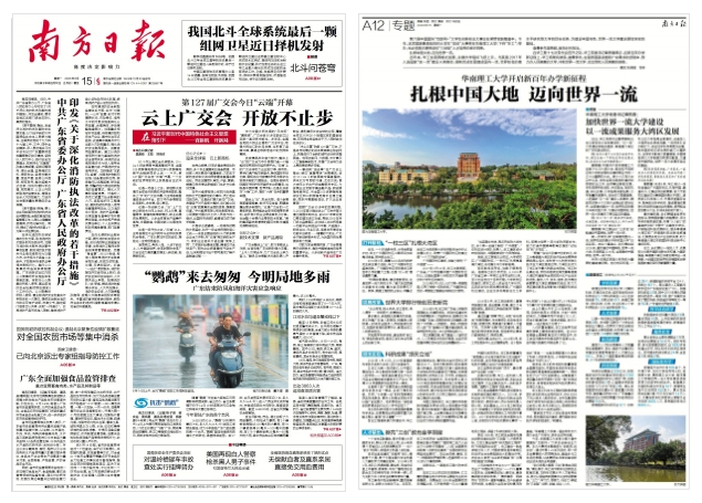 6月15日,《南方日报》以《扎根中国大地 迈向世界一流》为题刊登整版报道,回顾十六次党代会以来,学校党委坚决贯彻落实党中央的决策部署,在教育部党组、广东省委的坚强领导下,团结带领全校师生员工,积极进取、务实担当,深化改革、勇于创新,办学格局深度拓展,办学质量快速提升,综合实力显著增强,国内一流、世界知名的高水平研究型大学全面建成,并展望了新百年办学的新征程。报道全文如下: