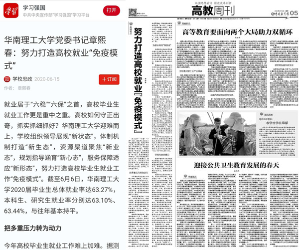 15日,学习强国学习平台、《中国教育报》刊登了华南理工大学党委书记章熙春的署名文章《努力打造高校就业“免疫模式”》,文章阐述了华南理工大学党委高度重视应届毕业生就业工作,在疫情期间迎难而上,通过落实就业责任、搭建就业平台、深挖内部潜力,学校组织领导展现“新状态”,体制机制打造“新生态”,资源渠道聚焦“新业态”,规划指导涵育“新心态”,服务保障适应“新形态”,努力打造高校毕业生就业工作“免疫模式”。报道全文如下: