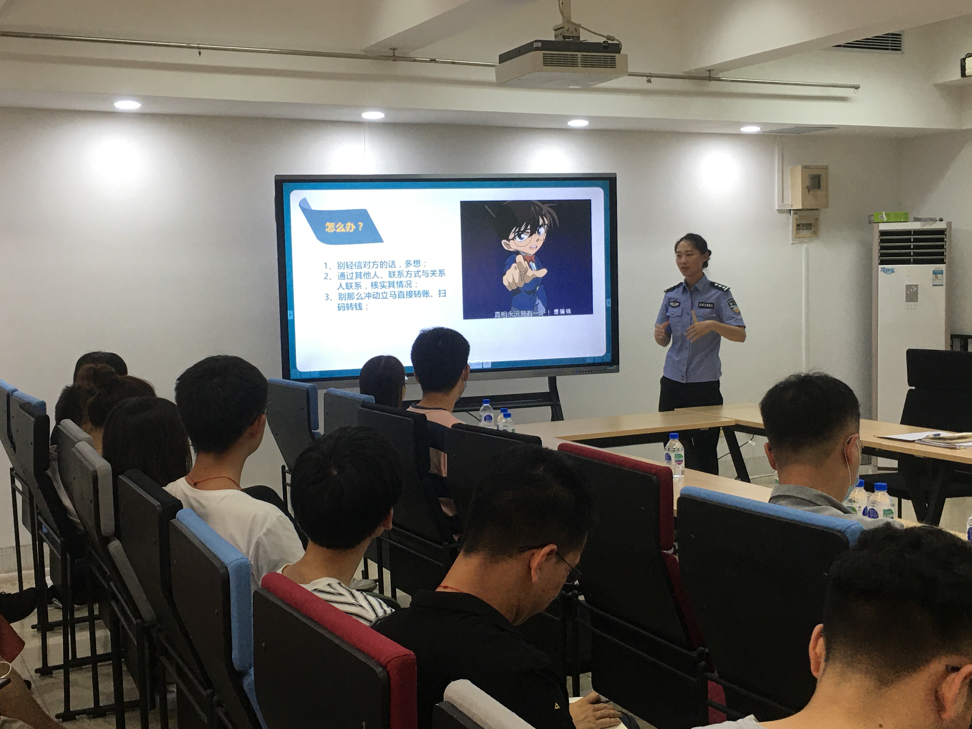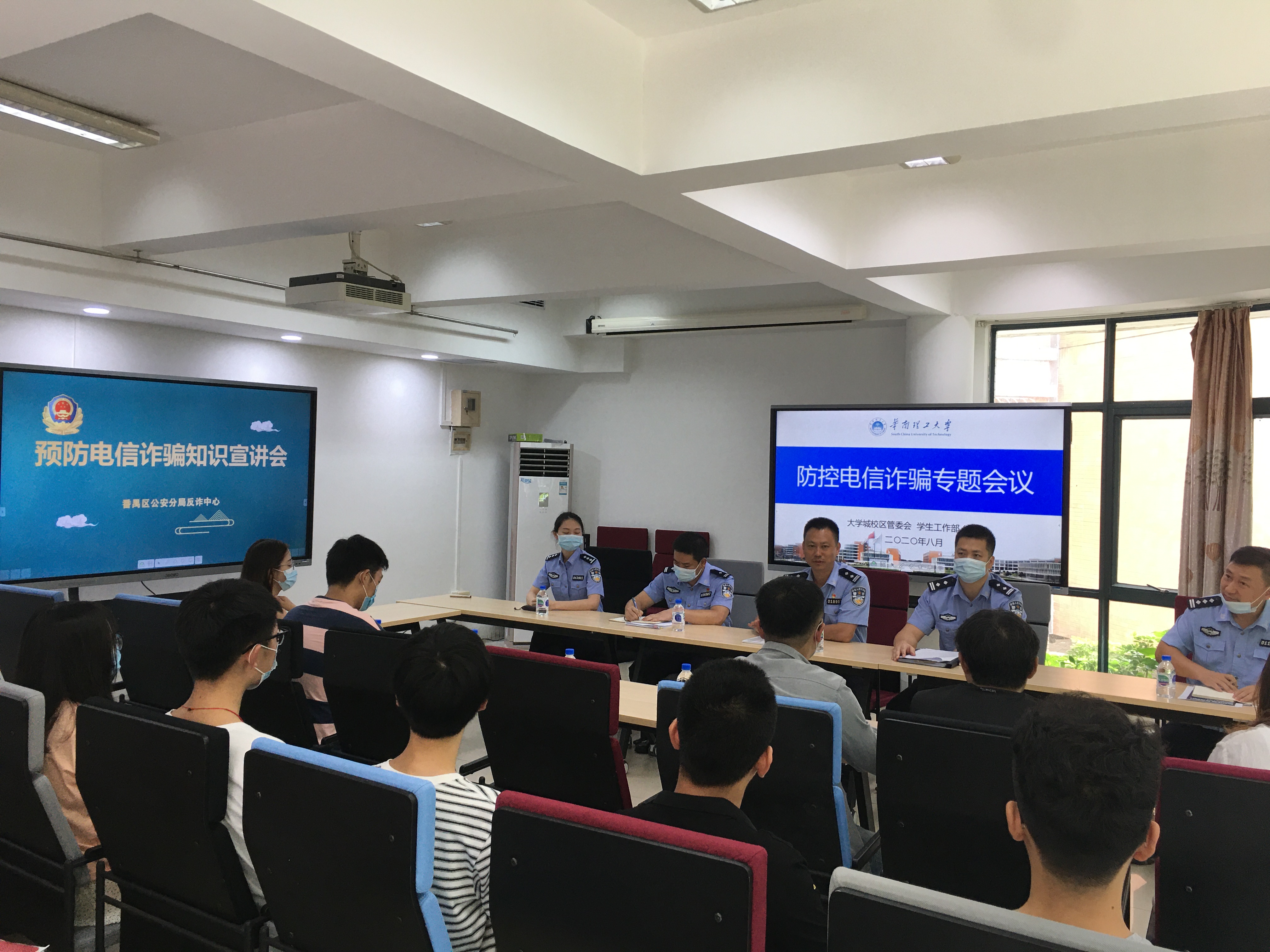 为进一步加大防范电信诈骗工作力度,有效遏制校园电信诈骗案件发生,提高师生识骗防骗意识,避免财产损失。8月13日下午,大学城校区管委会、学生工作部(处)联合小谷围派出所、番禺公安分局巡特警大队在大学城校区开展防范电信诈骗专题宣讲活动。各学院辅导员代表聆听了此次讲座。