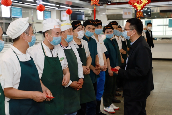 高松一行先后来到学六饭堂、西八学生宿舍、保卫部、笃行楼学校总值班室、校医院。每到一处,高松都热情地与值班人员交谈,并为他们送上新年利是。高松详细询问他们的工作和生活情况,对他们坚守岗位、辛勤工作和无私奉献表示感谢,并叮嘱他们保重身体,注意节日期间的值班安全,特别是要全力做好新型冠状病毒感染的肺炎疫情的防控工作。
