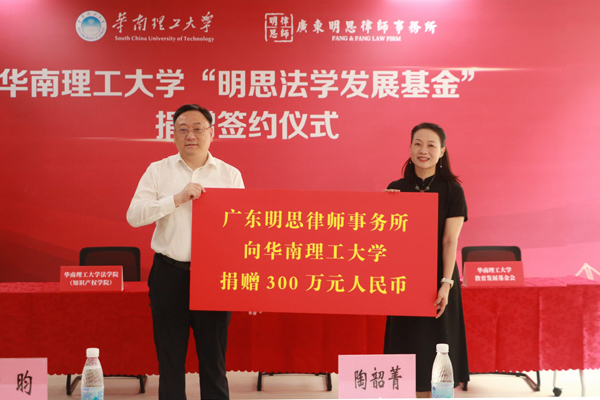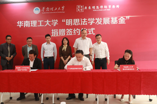 10月13日上午,明思法学发展基金捐赠签约仪式在华南理工大学法学院(知识产权学院)举行。华南理工大学党委副书记陶韶菁、广东明思律师事务所主任方昀,学校公共关系处、法学院(知识产权学院)相关负责人,法学院师生、捐赠单位代表出席了捐赠仪式。