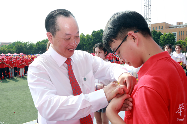 典礼现场,学校举行了校徽佩戴仪式暨赠送新生入学礼仪式,章熙春亲手为每一位学生代表佩戴校徽并赠送入学礼,祝愿学子们在华园激扬青春、收获理想。学生代表姚瑜琳表示,非常幸运以这样的方式正式开启大学生活,章书记给自己带上校徽的那一刻,自己感觉到了华南理工人身份的骄傲,与56万优秀校友为伍,自己必将在各方面见贤思齐,“今天我以华工为荣,明天华工以我为傲!”