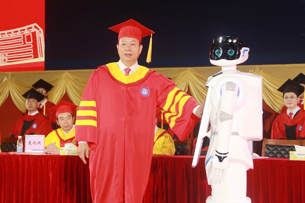 本次典礼经过精心策划,内涵丰富,亮点纷呈。为弥补大部分毕业生因疫情无法现场参与毕业典礼的遗憾,学校运用虚拟现实技术实现毕业生“云”入场,运用大数据技术为毕业生制作“电子成长档案”,并通过智能机器人将档案投递给学生。现场,章熙春触发机器人指令,为毕业生寄送“电子成长档案”。
