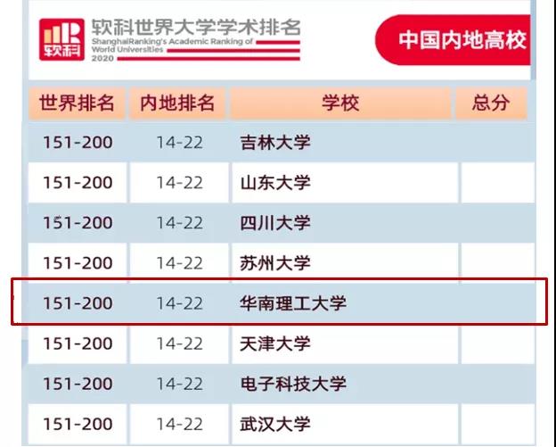 在8月15日发布的软科世界大学学术排名2020年榜单上,华南理工大学位列全球151-200位,首次进入该排名世界200强。