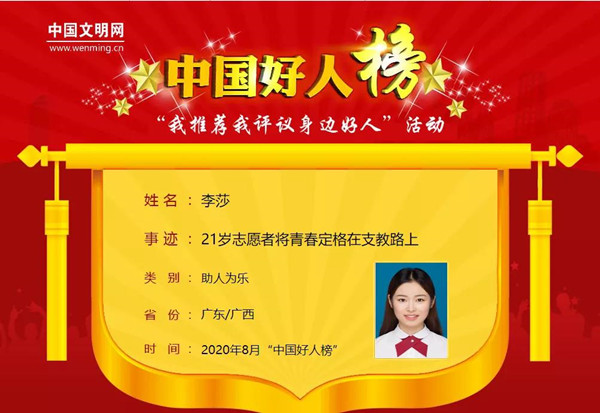 10月29日,中央文明办发布八月至九月“中国好人榜”,华南理工大学新闻与传播学院2019届本科毕业生、第21届研究生支教团成员李莎入选榜单,被评为“助人为乐好人”。