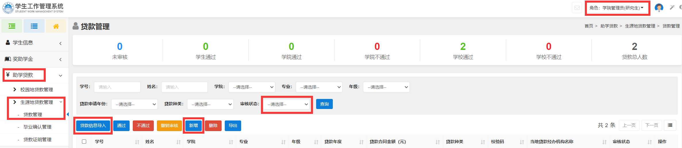 (2)研究生录入:已成功办理生源地助学贷款的,由各学院辅导员统一收齐生源地信用助学贷款回执(包括国开行和非国开行贷款),于9月9日前登录研究生学工信息系统(https://sms.scut.edu.cn/index.jsp)——生源地贷款管理模块——新增、录入——审核通过学生贷款相关信息(其中国开行贷款的回执校验码是必填的重要信息,若回执校验码填写错误将导致贷款不能成功发放,请务必准确填写)。操作界面如下图: