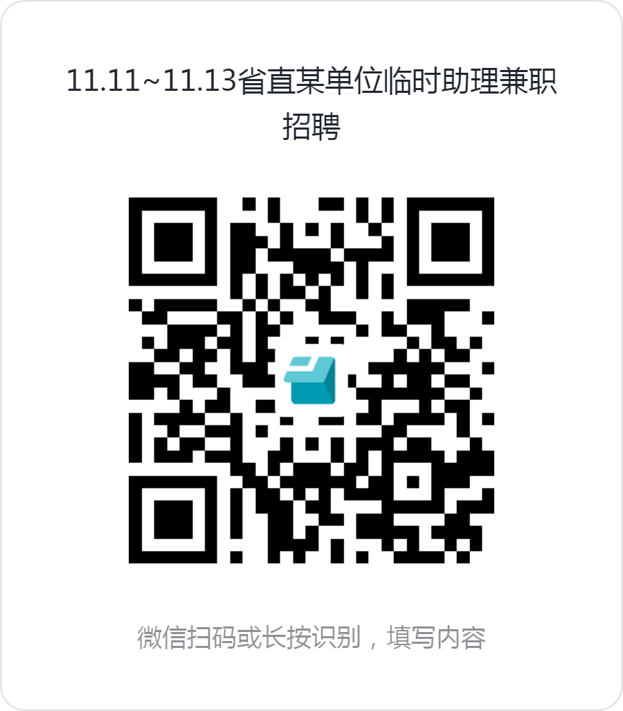 请五山校区有意报名的同学扫码填写问卷,请勿重复填写,信息包括“姓名+性别+学院+学号+联系方式+学生卡/学生证照片”,提交问卷后可查看省直群二维码,请及时进入工作群。问卷提交成功未及时加群的QQ发起临时对话联系“华工勤工助学小助手(2136362643)〞进群,如有疑问,可拨打87113564咨询。