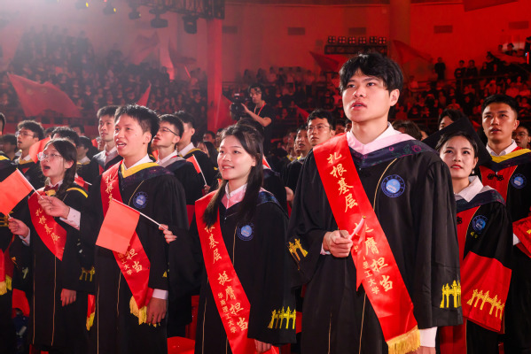 谨记校训精神,赓续百年荣光。承载着母校的期望与重托,陆子霖、齐映雪、王敏榕、吴易聪四位毕业生代表,以青春之名,带领全体毕业生立下庄严誓言。现场气氛迈向高潮。