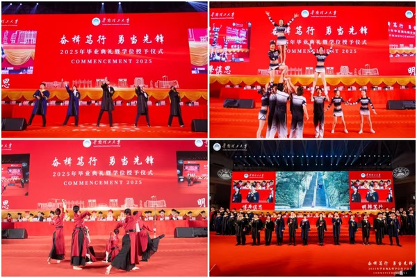 鲲鹏展翅云帆举,华园数载砺初心。今年的典礼上,来自艺术学院、体育学院、学生艺术团合唱团带来歌曲、啦啦操、剑舞等表演,祝福2025届毕业生在人生的海阔天空中,争做劈波斩浪的哪吒,让青春在奋进中,永远奔涌如鼓点。