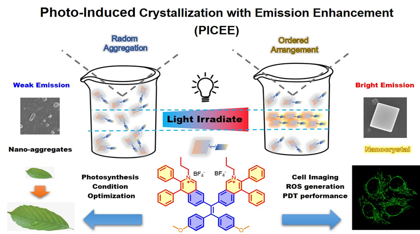 光激活材料由于其在超分辨率成像、生物传感和光学开关相关领域中的潜在应用,然而利用这种光化学的机制来实现光激活的材料仍存在很多亟待解决的问题。相比之下,光物理主导的光激活过程显得较有优势,但是材料实例体系鲜有报道。本工作我们提出一种基于AIE思想且光物理过程主导的新型光激活材料实例---光诱导结晶荧光增强(Photo-induced Crystallization with Emission Enhancement,PICEE)。该工作采用四苯基乙烯(TPE)骨架制备成异喹啉的有机盐衍生物(TIOdB),除了具有显著的AIE现象外,其在低功率连续光照射下,其在溶液中的荧光强度大幅度增强,具有显著的光激活特性。通过核磁、吸收-发射光谱等数据分析,该光激活过程并没有发生常见的化学反应,而是由光诱导分子聚集变化为主导的物理行为。通过SEM形貌表征,我们可以直观地观察到,随着辐照时间的延长,原本无规则的小的纳米颗粒逐渐消失并伴随着明显的大尺寸的晶体的形成,加之其AIE特性而导致荧光增强。借助晶体分析和初步的理论计算,这种物理过程可以解释为:在光激发下,激发态的TIOdB分子构象发生了变化,导致其通过分子间的强相互作用形成更加规整有序的排列,如纳米晶体或更大更紧密的聚集体。另外,所用光照强度与其荧光增加强度之间存在一定的线性关系,这在优化与监测植物生长条件上具有一定的应用潜力;同时,TIOdB具有良好生物相容性,其在高质量生物光激活荧光成像和诊疗中具有非常大的应用前景。这些结果表明,PICEE过程可以为设计原位形成纳米晶体和开发更多具有新的光激活机制的多功能材料提供一种新的策略。