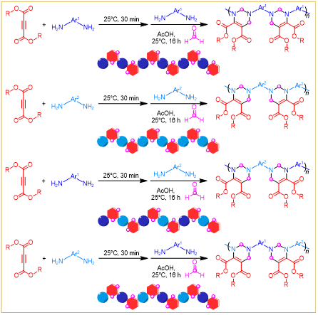 为了追求多组分聚合产物结构的多样性,拓展多组分聚合的适用范围,我们围绕具有丰富化学性质的炔类单体的反应进行设计,发展了系列炔类单体参与的多组分串联聚合。通过炔的多组分串联聚合构筑结构新颖多样的聚嘧啶、聚吲哚酮等含杂环或稠杂环的聚合物。另外,利用多组分串联聚合策略中对聚合过程的设计还可以调控线型或超支化高分子链上功能基元的排列顺序,从而实现对多组分聚合产物拓扑结构和序列结构的调控。
