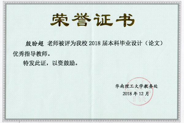 喜讯!研究院殷盼超老师荣获学校2018届本科毕业设计(论文)优秀指导教师奖