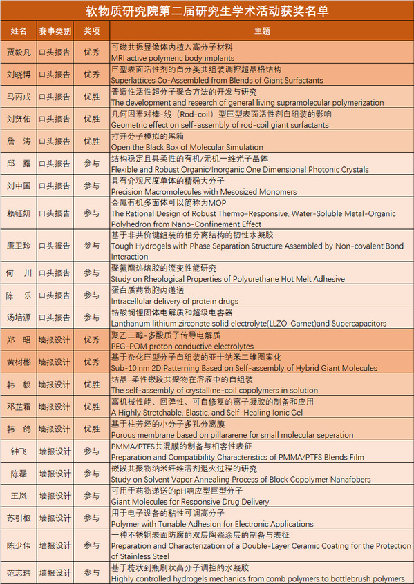“大动作·玩创新”严谨学术与墙报设计相结合,今年参赛选手给评委们展示出青年学子的思维活力和超强行动力。第二届研究生学术活动分为口头报告和墙报设计两部分,报告内容涉及“蛋白质药物胞内递送”“聚氨酯热熔胶的流变性能研究”“对水稳定的温度响应MOP制备”“可磁共振显像体内植入高分子材料”“基于非共价键组装的相分离结构的韧性水凝胶”等12项;墙报内容涉及“嵌段共聚物纳米纤维溶剂退火过程的研究”“高机械性能、回弹性、可自修复的离子凝胶的制备和应用”“用于电子设备的粘性可调高分子”“结晶-柔性嵌段共聚物在溶液中的自组装”等11项,覆盖软物质交叉学科各类方向。