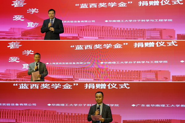 “善行华工•助学圆梦”。11月8日,华南理工大学分子科学与工程学院与上海蓝西实验设备有限公司共同设立的“蓝西奖学金”捐赠仪式在广州国际校区顺利举行,标志着广州国际校区首个企业奖学金设立。捐赠方上海蓝西实验设备有限公司董事长耿中卫和广州分公司总经理冯爱国;受赠方华南理工大学广州国际校区党委副书记、学生事务办公室副主任、书院院务主任陈翠峰,华南理工大学分子科学与工程学院副院长、华南软物质科学与技术高等研究院副院长王林格和学生代表出席活动。华南软物质科学与技术高等研究院办公室主任康德飞主持活动。