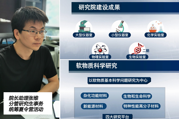 全国优秀大学生夏令营的举办旨在让更多优秀大学生了解学校、研究院以及导师情况,并根据双向选择和择优录取的原则,提前选拔一批符合资质的推免生,是吸引优质生源的重要途径。为了让夏令营学员在云端也能感受研究院的建设发展,我们在开营仪式做院情介绍之后,新增设了云游实验室环节,以现场直播的形式向学员们依次介绍大型仪器平台、化学实验室、物理实验室、生物实验室的设备、人员、方向等详细情况,并开设多个分会场由学员们自由选择进入不同导师的讨论组进行更为深入的面对面交流。