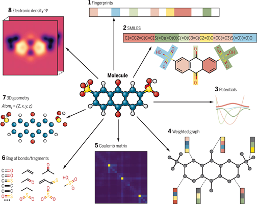 图4. 对于同一个分子不同类型的分子表示[7]。(1)指纹矢量;(2)SMILES字符串;(3)势能函数;(4)原子和键的权重图;(5)库伦矩阵;(6)键/片段的组合;(7)原子电荷的三维几何;(8)电子密度。