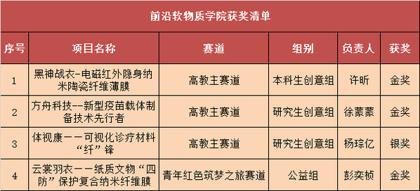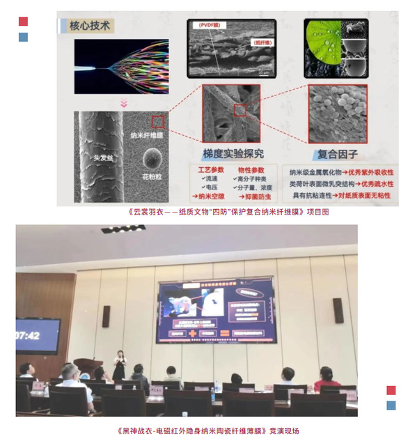 《黑神战衣-电磁红外隐身纳米陶瓷纤维薄膜》和《云裳羽衣——纸质文物“四防”保护复合纳米纤维膜》2个本科生项目分别获得高教主赛道和青年红色筑梦之旅赛道的校级金奖。在立项之初,2支本科生队伍都将目标确定在应用层面,不同的是前者以陶瓷前驱体为原材料,通过静电纺丝技术仿造北极熊的皮毛制备多层复合陶瓷纤维薄膜以高效的电磁屏蔽与红外隐身性能,应用于特种部队作战服、轻型装备外壳、轻量军用帐篷等军用领域和高辐射环境下的电磁屏蔽防护服、电磁屏蔽室覆盖材料等民用领域;后者选用具有抑菌、疏水作用的高分子,复合具有紫外线遮蔽作用的纳米级金属氧化物,使用静电纺丝法制备出具有一定机械强度的致密纤维膜应用于纸质文物保护,对现有塑封法和无酸装具包裹法进行可替代优化,开发出更多品类的防虫咬、防霉菌、防水珠、防紫外线的纸质文物保护类产品。