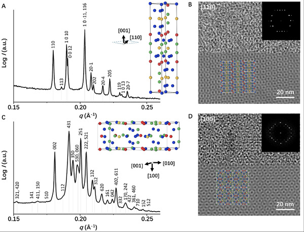 图3. μ相和ϕ相的结构表征。(A) μ相的小角X射线散射谱图及对应晶面指标。 (B) μ相特征晶面的透射电镜照片。(C) ϕ相的小角X射线散射谱图及对应晶面指标。 (D) ϕ相特征晶面的透射电镜照片。