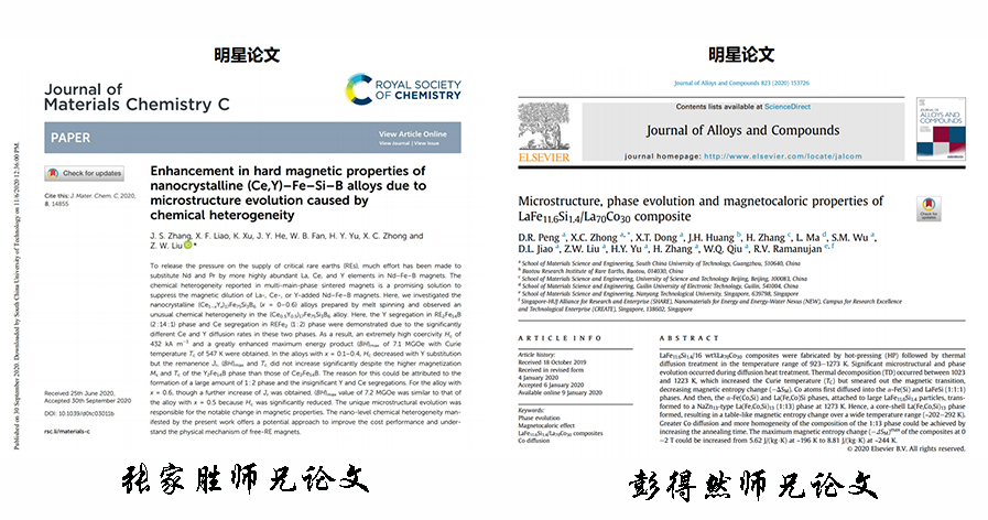 2020年课题组的学术成果收获颇丰。据目前的收集情况,2020年课题组论文数量达到31篇(SCI 28篇),申请中国发明专利7项,获得中国发明授权专利8项。涉及多个材料领域,包括永磁材料、磁致冷材料、软磁材料、薄膜与涂层材料以及其他材料领域。其中以张家胜师兄和彭得然师兄的两篇论文较为优异,张家胜师兄的论文解释了Ce和Y的偏析行为对永磁微观结构和性能的影响,澄清了化学非均质分布对不含贵重稀土的RE-Fe-B永磁磁性能提升的机制,对开发下一代高丰度稀土永磁有着较大的指导意义。彭得然师兄的论文探索了热处理温度以及时间对La-Fe-Si/La70Co30磁制冷复合材料微观结构和性能的影响,阐明了1:13相重组的机制以及Co原子的扩散行为对性能的影响,对通过烧结+晶界扩散技术制备La-Fe-Si基磁致冷复合材料有较大的指导意义。【点击图片,查看月报特刊全集】 |