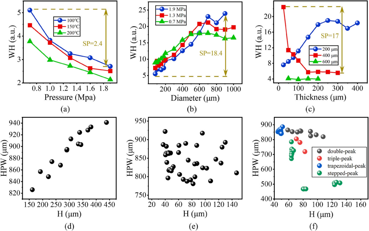 图6. MIF的形状可调性。WH随(a)压力、(b)气缸直径、(c)环厚度的变化。HPW和H的点云图:(e)压力调节、(f)气缸约束、(g)环约束。