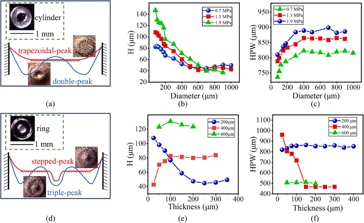 图4. 约束结构对FFL形成的影响。圆柱体:(a)两个典型FFL的示意图和测量图像。插入物显示了圆柱体的图像。(b)H随气缸直径的变化。(c)HPW随气缸直径的变化。环:(d)两个典型FFL的示意图和测量图像。插入物显示了环的图像。(e)H随环厚度的变化。(f)HPW随环厚度变化。