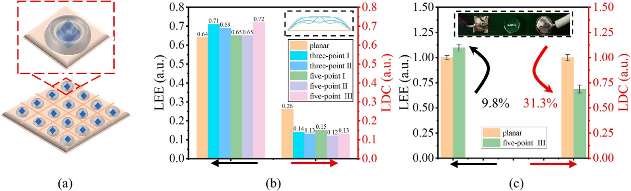 图8. MIF在微型LED封装中的应用。(a)不同FFL的微型LED封装示意图。(b)不同FFL的微型LED封装的LEE和LDC,插入图描绘了FFL的形状。(c)五点III FFL封装和平面封装的微型LED的光学性能比较,插入图描绘了微型LED封装的图像。