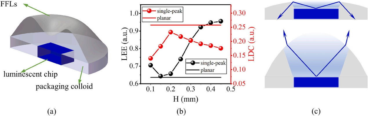 图7. FFL封装微型LED的光学性能模拟。(a)光学模拟模型。(b)平面封装和单峰FFL封装的LEE和LDC。(c)平面封装和单峰FLL封装的发光机制。