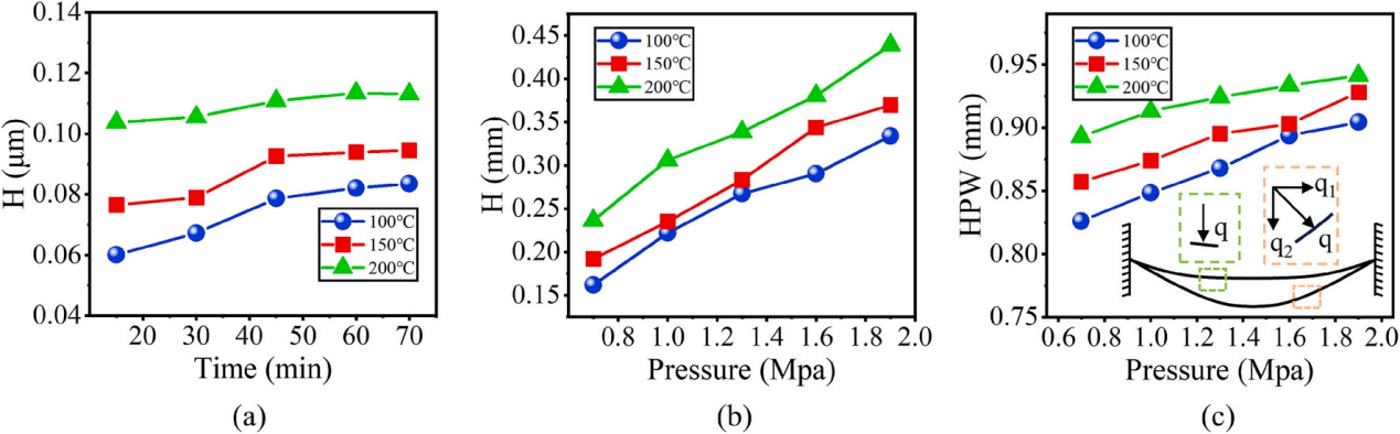 图3. 压力调节对FFL形成的影响。(a)H随保持时间的变化。(b)H随压力的变化。(c)HPW随压力的变化,插入图是薄膜的受力分析。