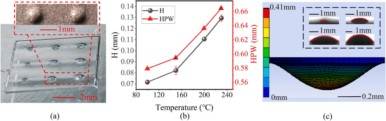 图2. 温度调节对FFL形成的影响。(a)制备的基于PDMS的FFL的图像,并附有显示测量图像的插入图。(b)直径为1mm的FFL的H和HPW随温度的变化。(c)可变形ETFE薄膜的模拟示意图,其中插入图显示了不同直径薄膜的横截面曲线以及相应实验制备的FFL轮廓。