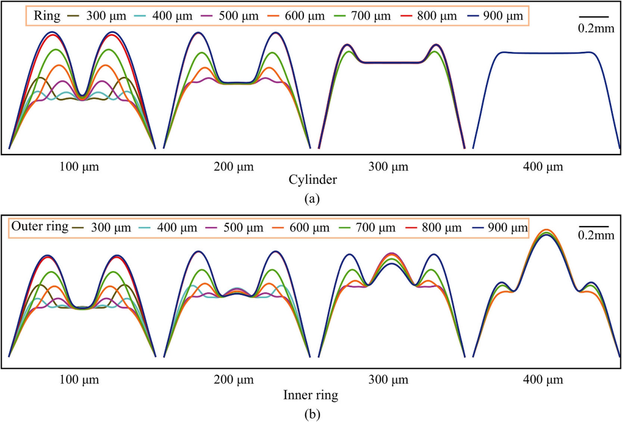 图5. Ansys模拟:组合约束结构对FFL形成的影响。(a)具有不同圆柱直径和环内径的不同圆柱环约束结构的FFL轮廓曲线的变化。(b)具有不同内环和外环内径的不同双环结构的FFL轮廓曲线的变化。
