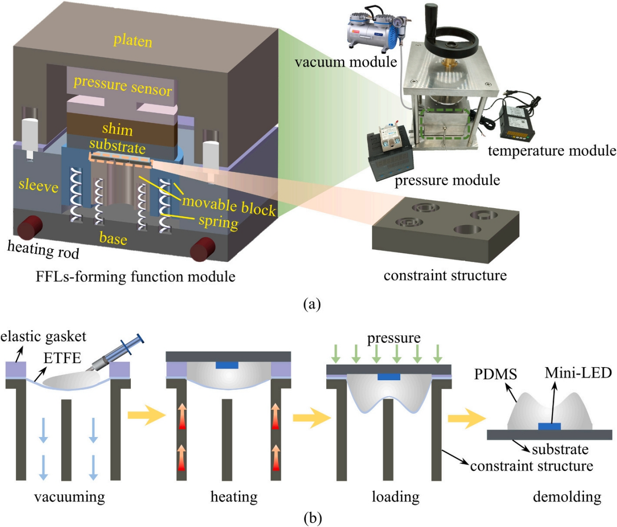 自由透镜(FFL)通过精确调节光分布在提高微型LED的光学性能方面发挥着关键作用。然而,在原位制造复杂形状透镜的成型过程中,传统方法无法精确控制FFL几何形状,需要加工不同的刚性金属模具并频繁更换FFL成型平台,从而延长了设计-制造周期。在此,我们提出了一种模具集成原位制造(MIF)技术,该技术利用压力驱动的可变形薄膜作为软模具,与局部约束结构相互作用形成特定的自由曲面。光学封装材料注入变形后的软模具并转变为所需的透镜形状,从而能够精细调节和快速制造复杂曲率的FFL。结果表明,将压力从0.7 MPa增加到1.9 MPa可以有效地调节FFL的高度和半峰宽,与温度调节相比分别增加了238%和42%。引入局部约束结构后,FFL的形状可调性显著增强。圆柱体和圆环约束的形状参数分别是没有约束的7.6倍和7倍。最后,该技术被应用于微型LED与FFL的一体化模压封装,与平面封装相比,新型器件光提取效率提高了9.8%,亮度色散系数降低了31.3%。这项研究表明,MIF是快速制造复杂形状FFL的有前景的解决方案,在提高小型化光电器件的整体光学性能方面具有巨大潜力。