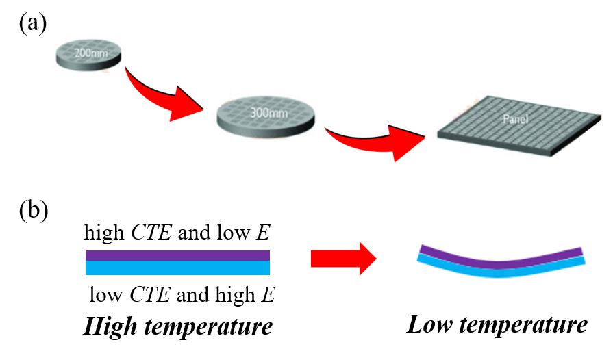 图5. (a) 扇出封装(FOP)中重构载板尺寸的发展 [35];(b) 由材料热膨胀系数(CTE)与弹性模量(E)不匹配引发热变形的原理。