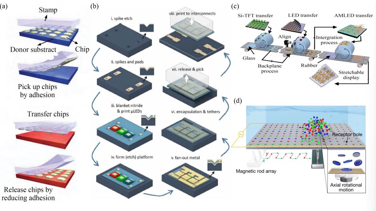 图6. (a) 基于范德华力的拾取 - 释放转移;(b) 基于范德华力的拾取 - 释放转移在扇出型晶圆级封装(FOWLP)中的应用;(c) 辊压转印技术;(d) 磁辅助与介电泳辅助自组装工艺 。