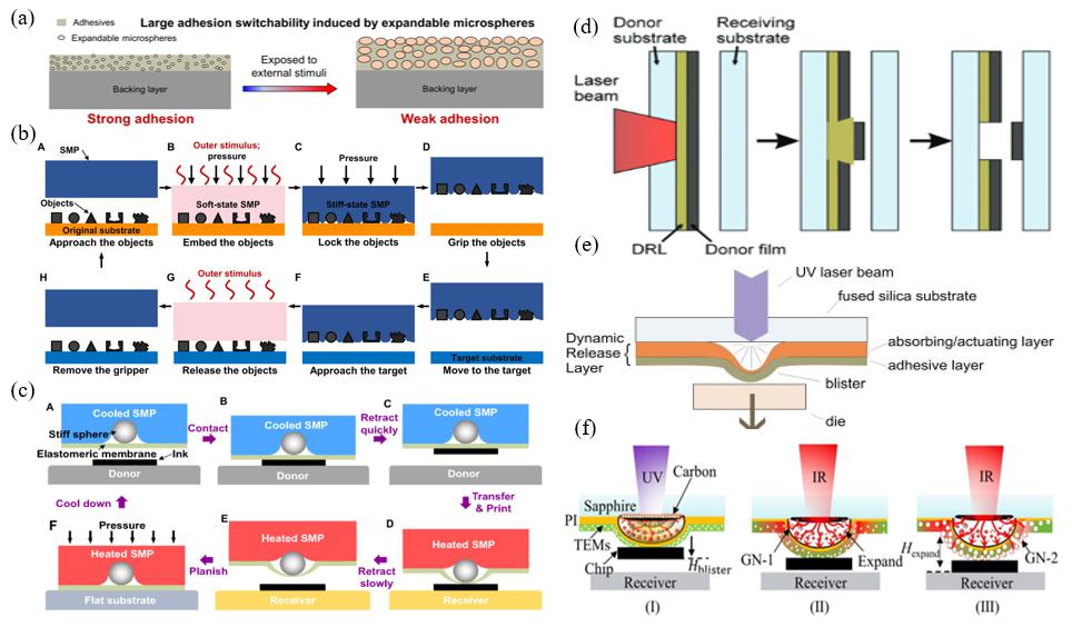 图7. (a) 激光改变掺杂发泡粉末的压模的粘接力;(b) 形状记忆聚合物(SMP)转移工艺;(c) 嵌入钢珠的形状记忆聚合物(SMP)压模转移;(d) 激光诱导前向转移(LIFT);(e) 泡罩式激光诱导前向转移(BB-LIFT);(f) 双激光驱动泡罩式激光诱导前向转移(BB-LIFT)。