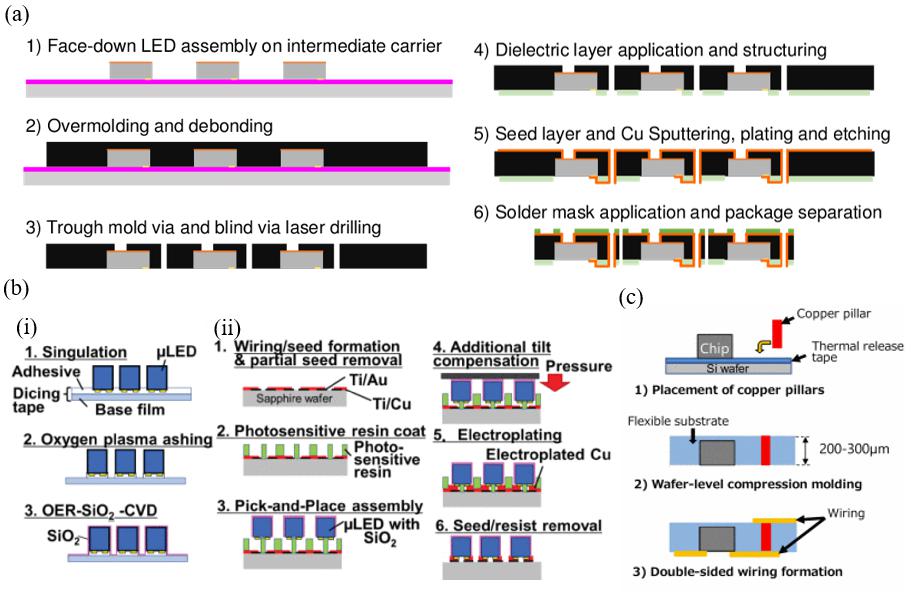 1.在工艺路线方面:总结了 LED 扇出封装的不同工艺路线,并指出了这些工艺路线在制造过程中普遍面临的芯片偏移(die shift)与翘曲变形(warpage deformation)的可靠性问题。