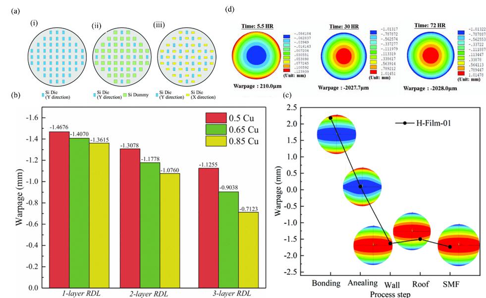 图10.(a) 芯片布局:(i) 传统布局方法、(ii) “假人”替换法及 (iii) 间隔排列法;(b) 不同铜(Cu)比例的重布线层(RDL)及数量对翘曲的影响;(c) 热退火工艺降低翘曲变形;(d) 环氧模塑料(EMC)分别在 85℃、85% 相对湿度(RH)环境下暴露 5.5 h/ 30h / 72 h时产生的翘曲。