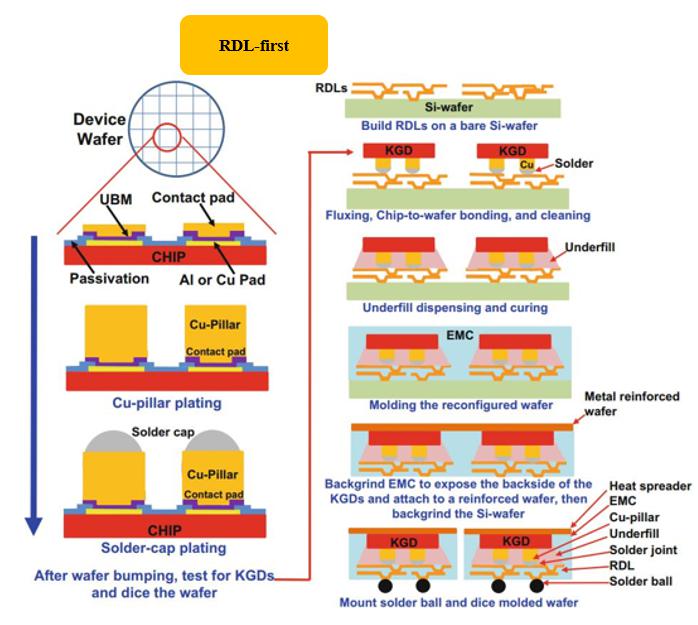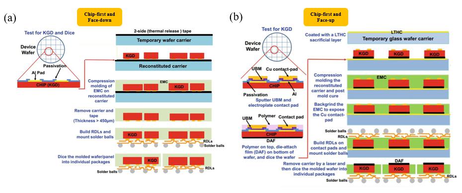 图3. 芯片优先工艺:(a) 电极面朝下与 (b) 电极面朝上 。