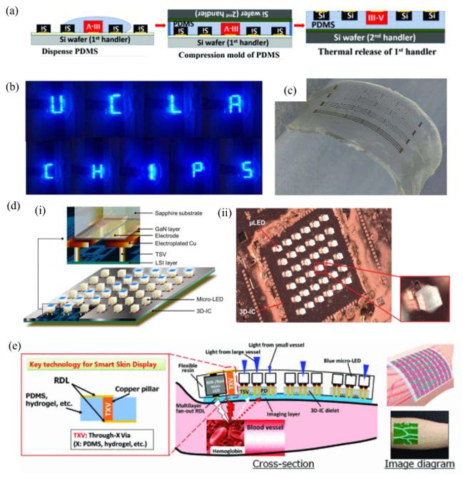 图14.(a) FlexTrate™工艺中的创新步骤与 (b) 基于该工艺的柔性显示屏发光效果;(c) 水凝胶基底上金线互联制备的俯视图;(d) 通过半加成法(SAP)将微型发光二极管(Micro LEDs)与含硅通孔(TSVs)的三维集成电路(3D-ICs)键合:(i) 示意图与 (ii) 实物图;(e) 采用半加成法(SAP)与 TXV 工艺的柔性智能皮肤显示屏。