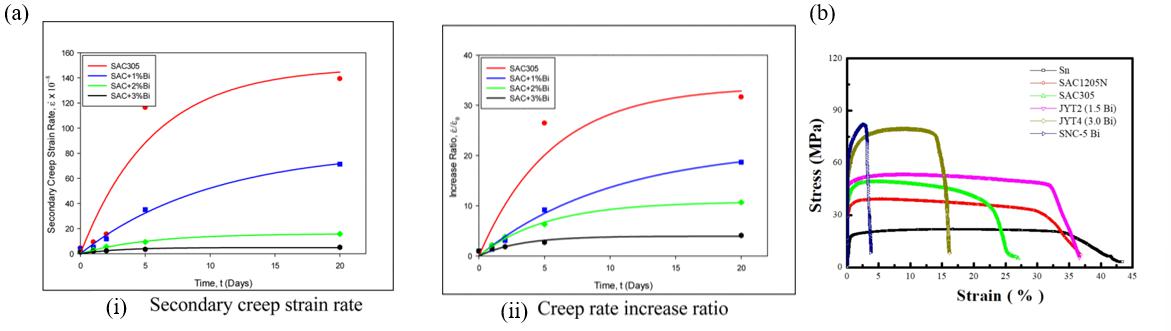 图12.(a) 各类焊料在热循环条件下的(i)二次蠕变应变率与(ii)蠕变率增加比对比 ;(b) 铋(Bi)元素可提升焊料强度。