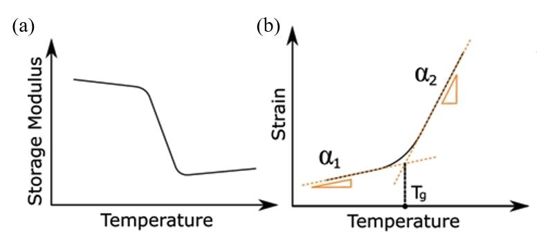 图8. 环氧树脂材料的性能:(a) 弹性(储能)模量;(b) 热应变随温度的变化关系。