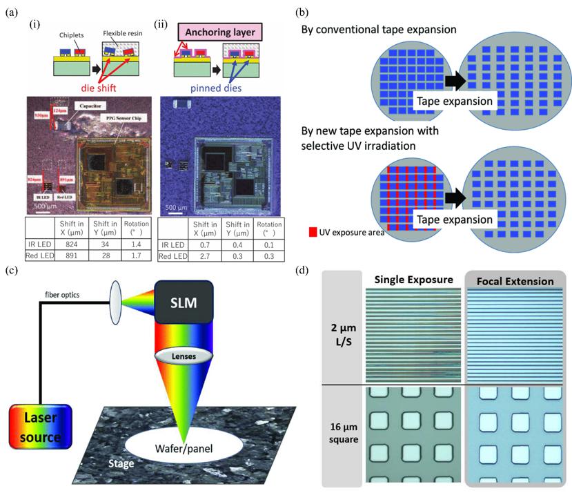图9.(a) 两种微型 LED 嵌入聚二甲基硅氧烷(PDMS)中(无锚定层(i)与有锚定层(ii))的芯片偏移对比;(b) 传统载带拉伸问题及通过选择性紫外(UV)照射实现的先进载带拉伸技术 ;(c) 激光直写光刻技术的基本设计 ;(d) 采用单次曝光与焦深扩展曝光技术制备 2 微米线宽 / 线距图形及 16 微米正方形图形的效果对比 。