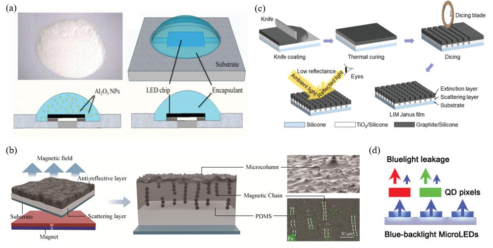 图13.器件光学性能优化实例:(a) 添加 Al₂O₃(氧化铝)功能粒子;(b) 利用磁操控形成微柱与磁链结构;(c) 通过切割工艺制备表面微结构阵列;(d) 量子点光致变色转换 。